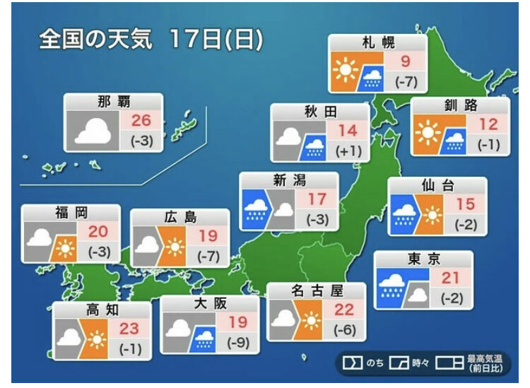 ・関東は雨の後に冷たい風 ・西日本は日差し戻っても気温低い ・日本海側は雨が降り、北海道は雪の所も 今日17日(日)は低気圧や前線が東に離れ、日本付近は一時的に冬型の気圧配置になります。上空には寒気が流れ込んで、全国的に気温が下がる見込みです。一気に秋が深まります。