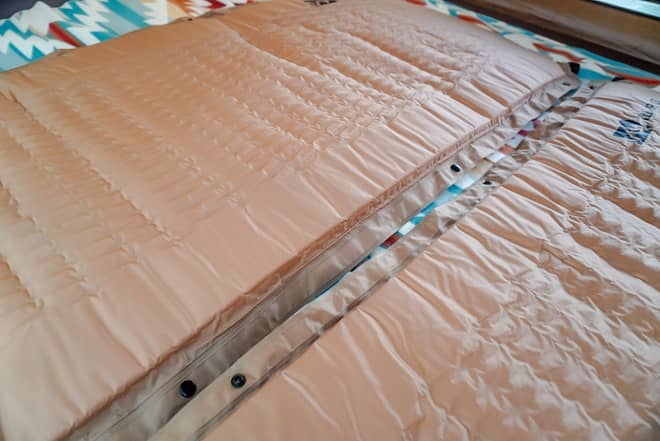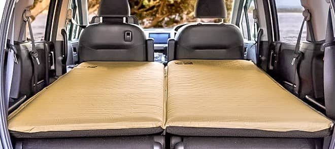 WAQインフレータブルマットは、ミニバンのフルフラット用のマットとしてぴったり収まるサイズに作られています。2枚を連結して使えば、全面ベットのように使うことが出来ます。