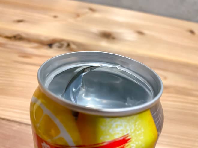プルタブを取ったら、空き缶の上蓋をよく観察します。すると飲み口の向かって右側はきれいにカーブを描いて丸まっていますが、左側は切れ目が途中で止まっているのが分かります。この切れ目がスタート地点です。