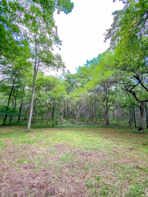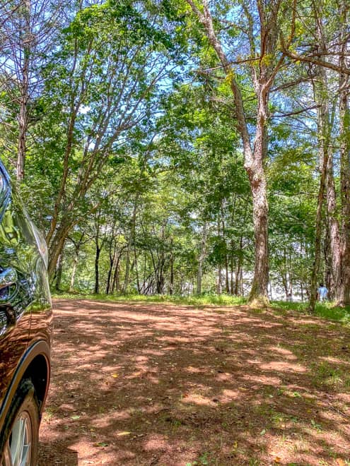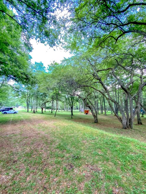 実際は、目と鼻の先。駐車場のすぐ後ろは車一台分の道があり、木が生えているところからフリーサイトとなります。
