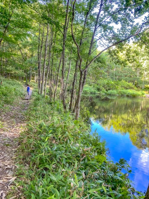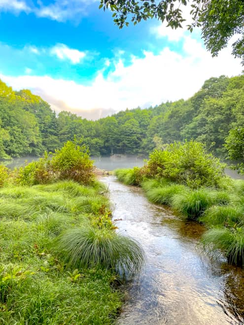 場内に美しの池という池もあり、そちらにも小川に降りられる場所があるんです。そこを池の中心に歩くと島のようになった池の中心に出られ、朝は霧も出て神秘的でおすすめです。