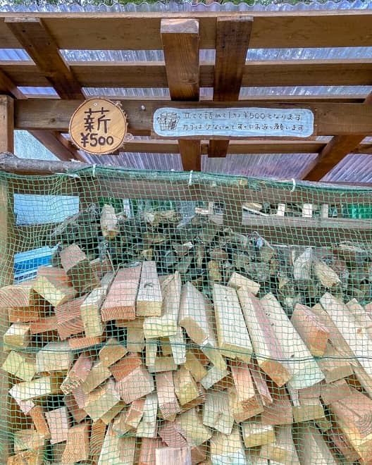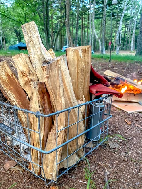 販売されている薪は、このカゴいっぱいに自由に詰めて500円!みんなで選びながらカゴに入れていくのが楽しい!ただ、スーパーの詰め放題のノリで詰めちゃうと重すぎて一人では運べない事態になるので注意。