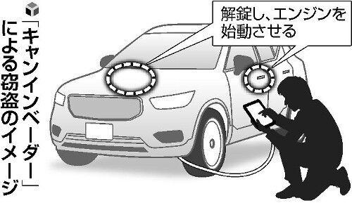 埼玉県警幹部によると、自動車窃盗を巡っては、電子キーが発する電波を中継、増幅して盗む「リレーアタック」と呼ばれる手口が数年前から続発していたが、最近ではキャンインベーダーによる犯行が主流になっているという。県内でも今年に入り、ランドクルーザー約80台が盗まれる被害が確認されており、県警はいずれもキャンインベーダーによる犯行とみている。