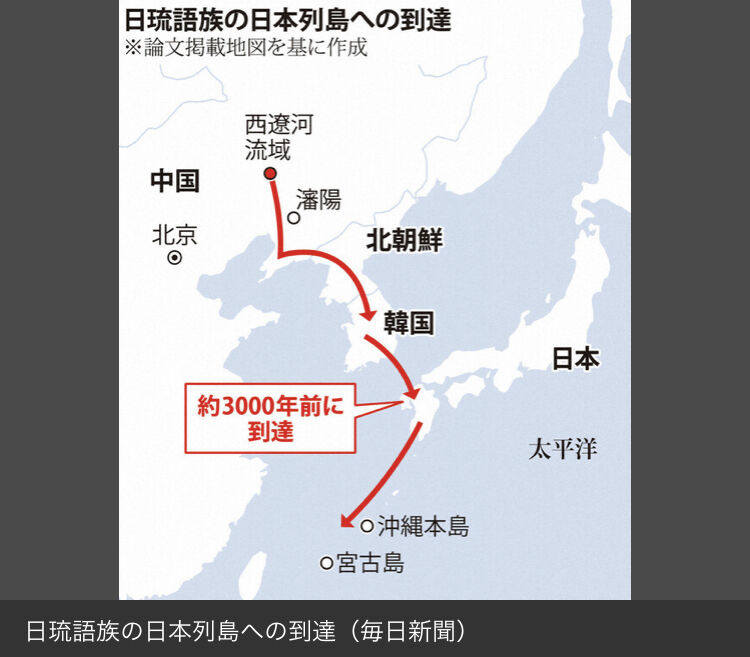 その結果、この共通の祖先は約9000年前(日本列島は縄文時代早期)、中国東北部、瀋陽の北方を流れる西遼河流域に住んでいたキビ・アワ農耕民と判明。その後、数千年かけて北方や東方のアムール地方や沿海州、南方の中国・遼東半島や朝鮮半島など周辺に移住し、農耕の普及とともに言語も拡散した。朝鮮半島では農作物にイネとムギも加わった。日本列島へは約3000年前、「日琉(にちりゅう)語族」として、水田稲作農耕を伴って朝鮮半島から九州北部に到達したと結論づけた。
