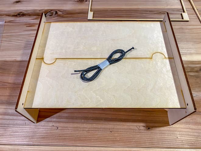 最後にミニテーブルのパーツを組み上げるとコンパクトテーブルが完成だ。しかし、パーツをはめ込んだだけの状態だと足がグラグラしてしまうので、同梱されているゴムを先ほどの穴に通してしっかり引っ張ることで固定しよう。