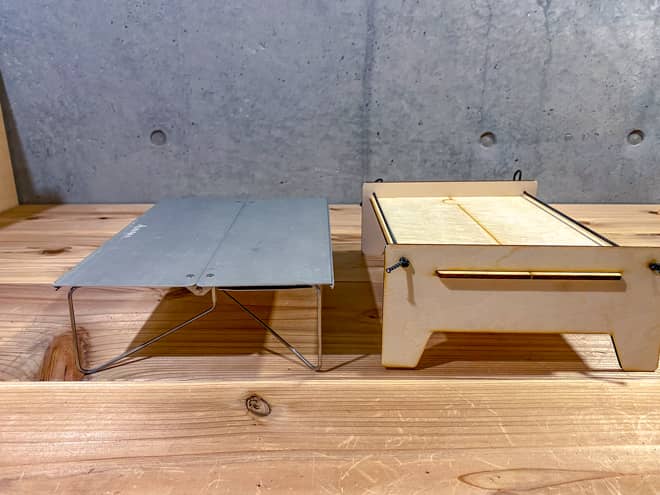 テーブルの高さはキャンプ工作キットの方が高く見えるが、天板の位置を見るとほんの僅かな差でしか無いのが分かる。