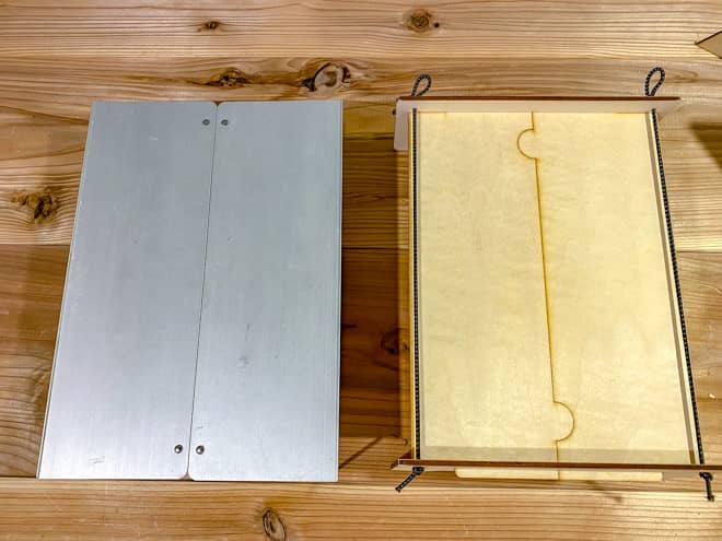 ビニール袋に包まれた本体は、裏面に組み立て方が書かれた説明書と2枚の木板、1本のゴムが入っているのみで、非常に簡素なものだった。収納袋は付いてないので100均でサイズが合うものを探すといいだろう。