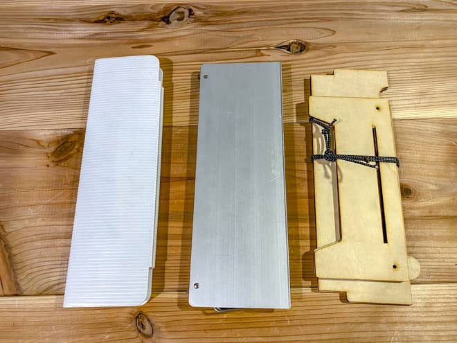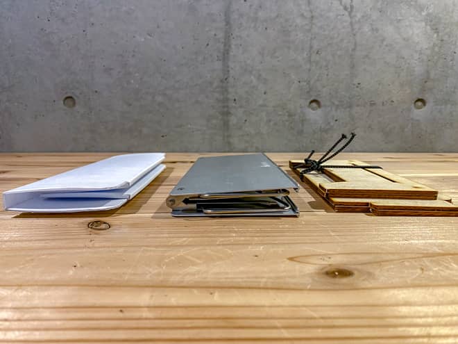 横から見ても厚みはキャンプ工作キットが一番薄い。ポケットの隙間や収納ケースの空いてるスペースにスッと収まるだろう。だが、木材なので「水濡れ」に弱いのが不安点か。