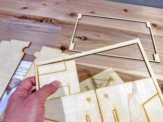 セット内容の2枚の木板はレーザーカットされているので、軽く押すだけでペキペキと型から抜けていく。力加減を間違えて本体を割ってしまわないように丁寧に型抜きを楽しもう。キレイに抜けるとちょっとした快感もあるぞ。