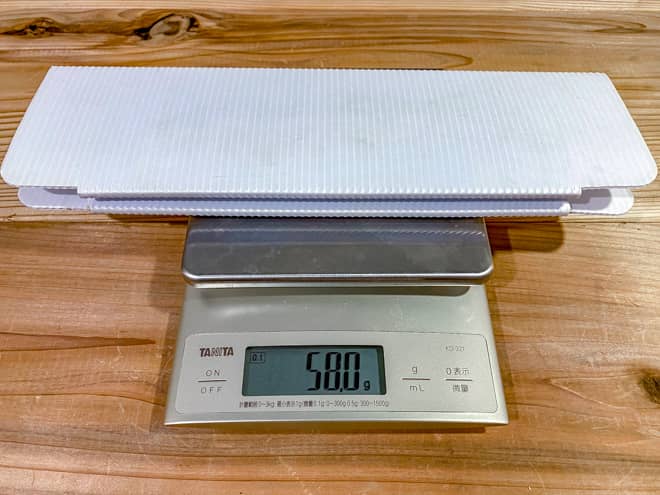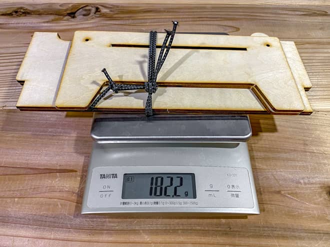 キャンプ工作キットのミニテーブル単体の重さは182.2gだった。製品仕様には220gと記載されていたが、おまけの鍋敷きやスマホスタンドなどを抜いた本体重量がこれだ。