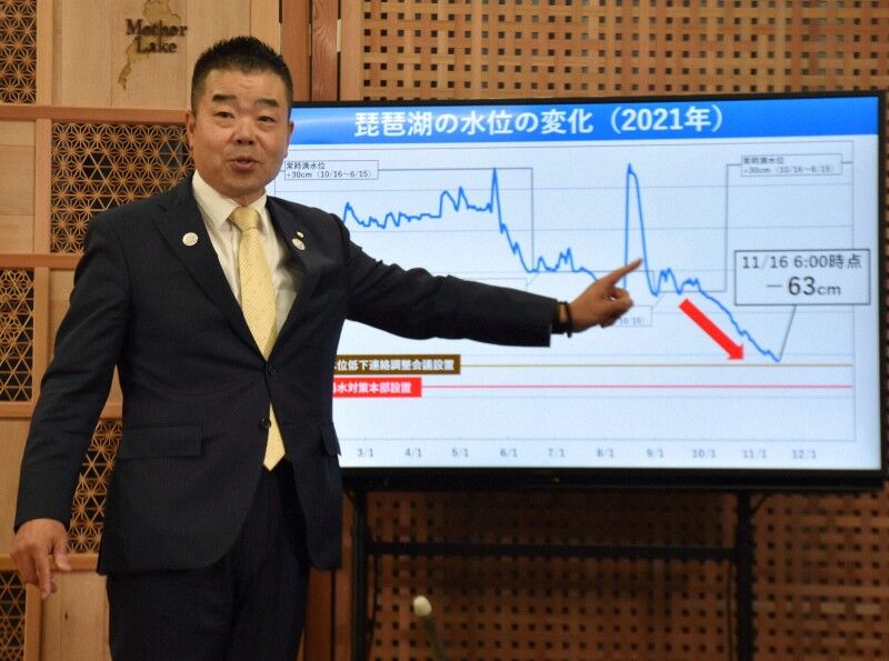 水位がマイナス60センチを下回るのは2007年以来14年ぶり。台風シーズンにまとまった雨がなく、10月以降も降雨が少なかったことが原因とみられる。県は、マイナス75センチに達した場合、渇水対策本部を設置し節水を呼び掛ける。同90センチになると近畿地方整備局が中心となって、関係府県を対象に取水制限が実施される可能性がある。