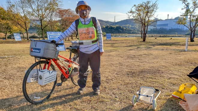 粛々と清掃活動を続けていると、「たま川のプラゴミひろい隊」という手作りゼッケンをつけた個人ボランティアのタカハチ(仮名)さんと出会った。