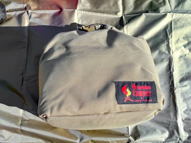 ブランケットが一枚あると、夏キャンプでは寝袋やマット代わりになったり、冬キャンプでも焚き火タイムから就寝時まで色んな場面で役立ちます。積載サイズは大きいですがバッグの外部に固定できるので、この利便性は外せません。これ一枚でミリタリー感を演出できるお気に入りグッズ。