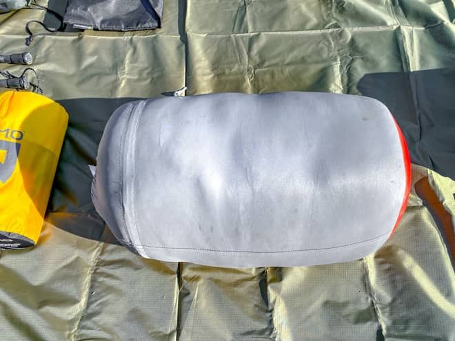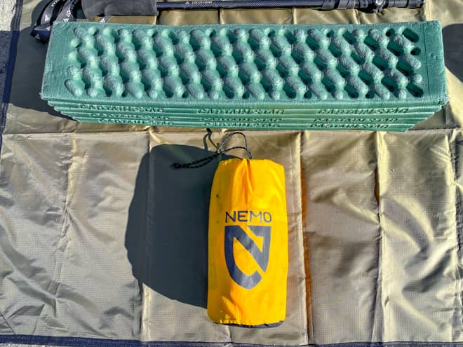 冬キャンプを想定してモンベルのダウンハガーを持って来てますが、春~秋の3シーズンの場合はもっとコンパクトに収まるシュラフを選ぶと積載にも余裕ができます。イスカの「エア」シリーズとかは収納サイズも小さくて、まあまあのお値段なのでおすすめ。