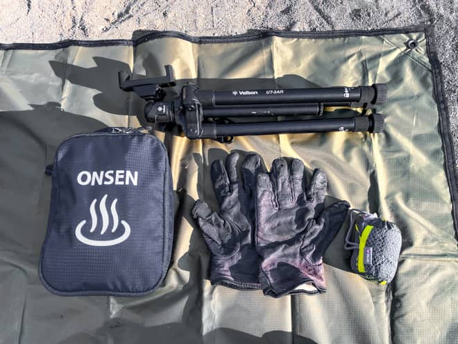キャンプ帰りに温泉に入る用の着替え&歯ブラシセットと、焚き火用の皮手袋、超コンパクトにまとまるミニタオルと、撮影用にスマホを固定する三脚などの小物類。