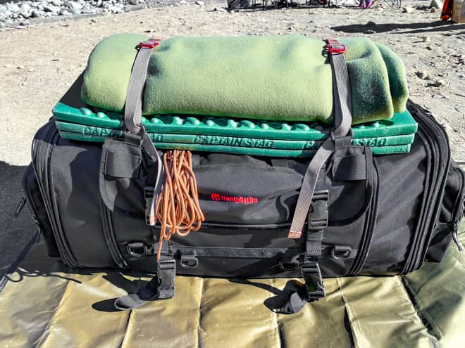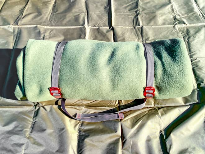 ミルテックのフェルトブランケットをエクスペドのストラップで固定して、EVAフォームマットと一緒にツーリングバッグに外付けしてます。