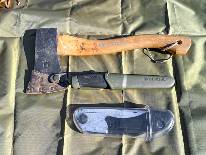 一番実用性が高いのは手斧で、ナイフとコンパクトノコギリはもはや趣味の枠。無くても平気です。