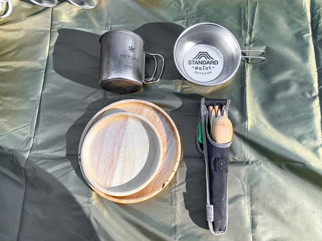 ちょっとオシャレな木製ランチプレートとカトラリーセットに、スノーピークのチタンマグとシェラカップを用意。これまでのところ、このセットで不満を感じたことは無いので必要充分なんだと思います。汁物から主菜、副菜までカバーできます。