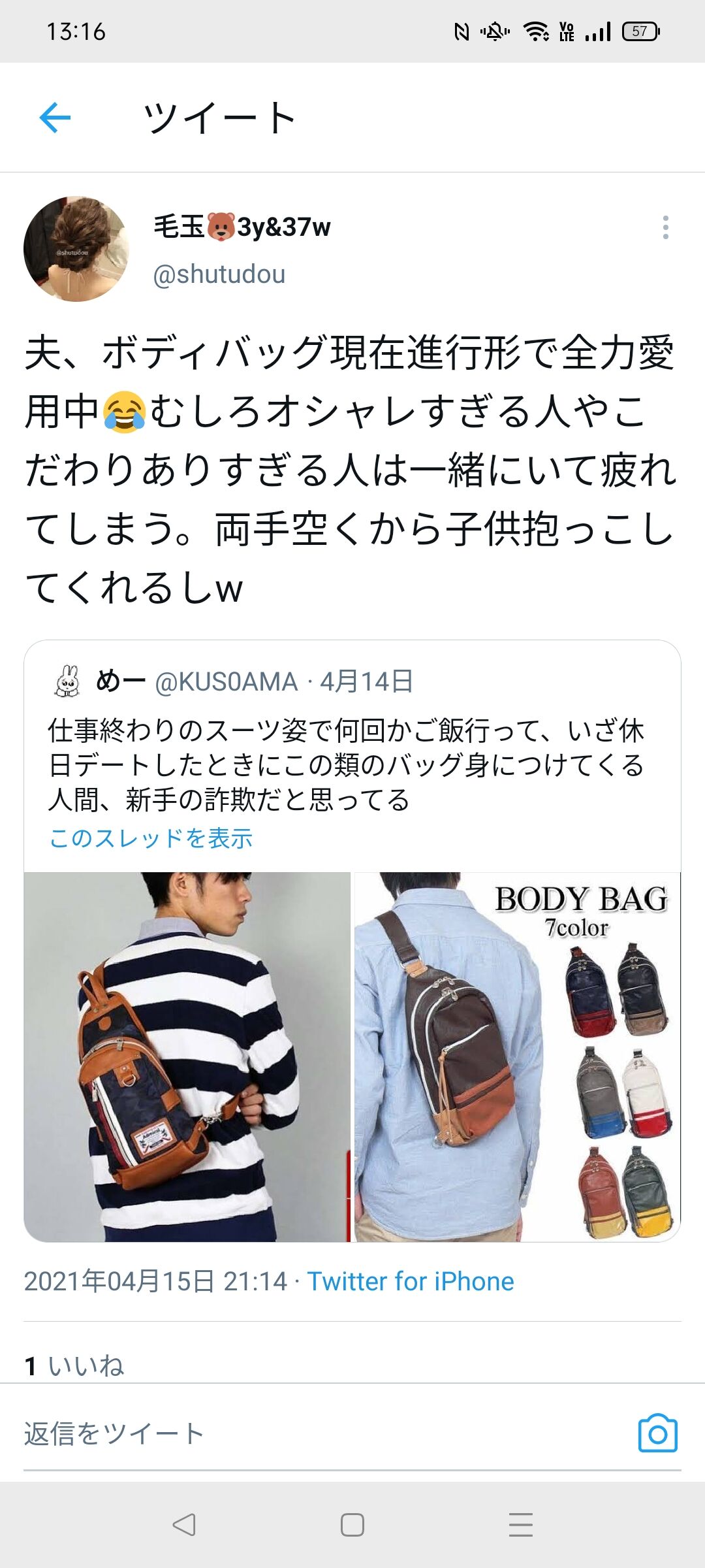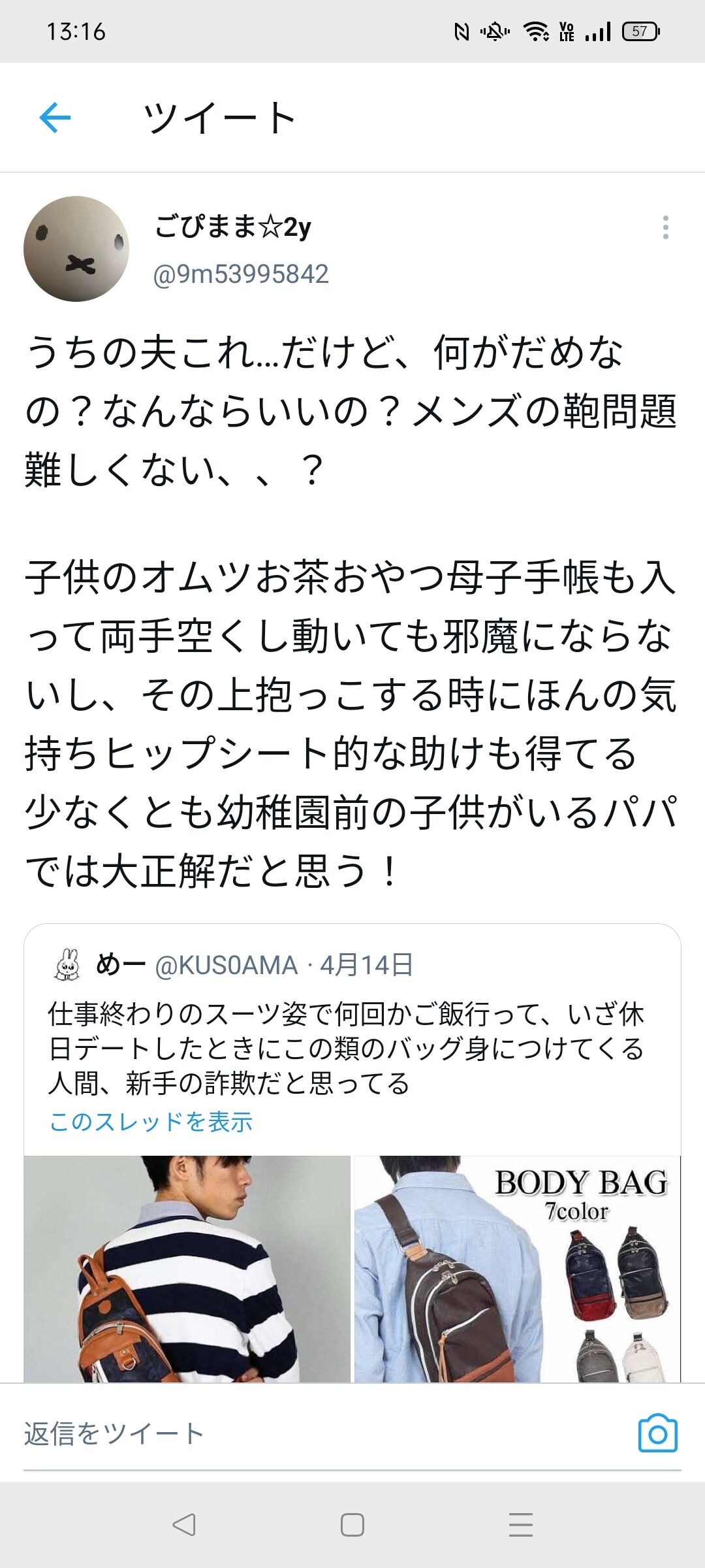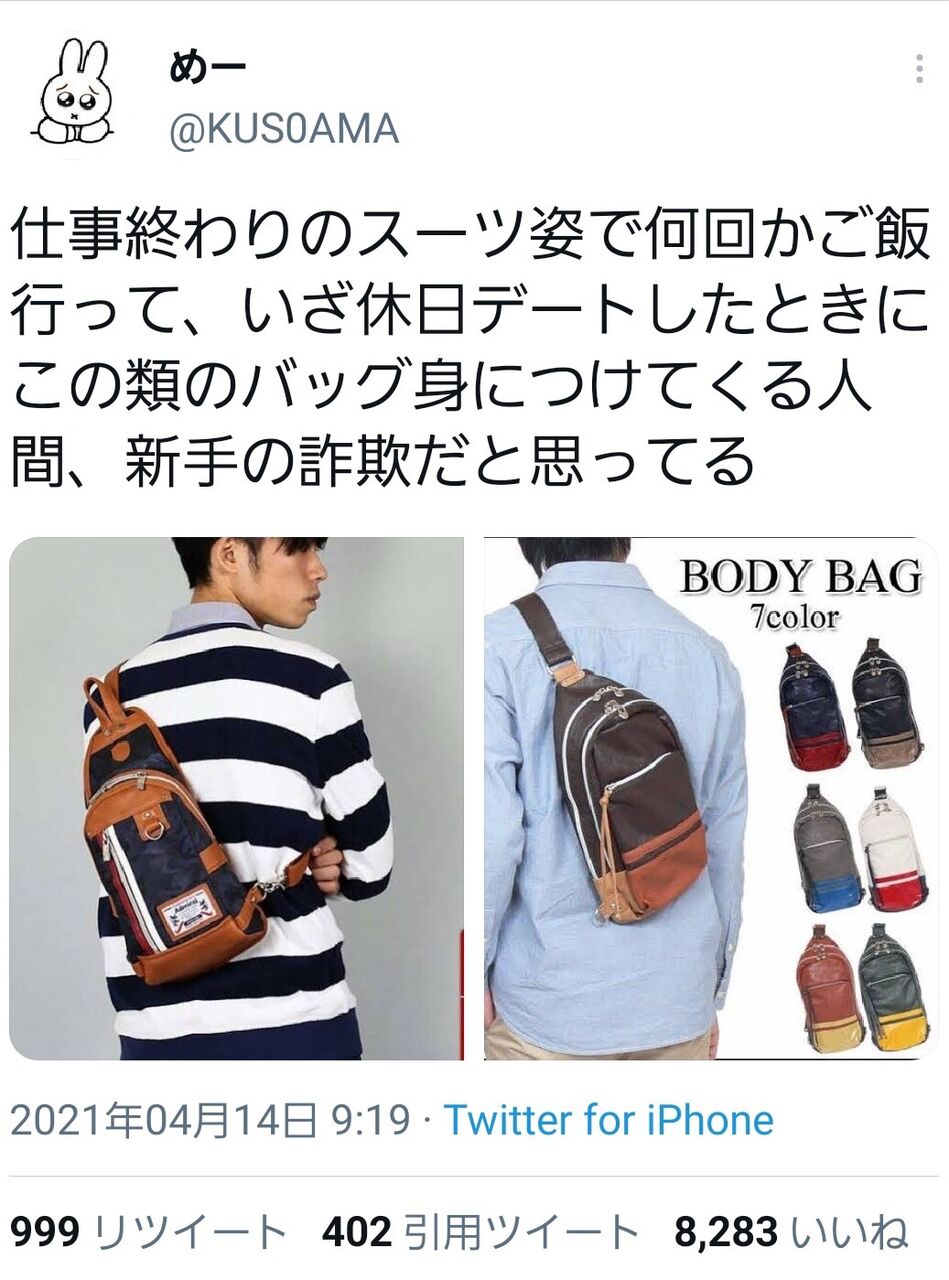 【画像】独身まんさん「男のボディバッグダサすぎw」既婚女性「プークスクス」ま「ギャオーン!」