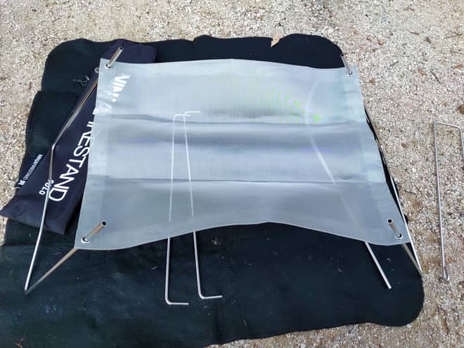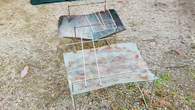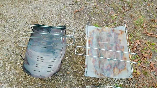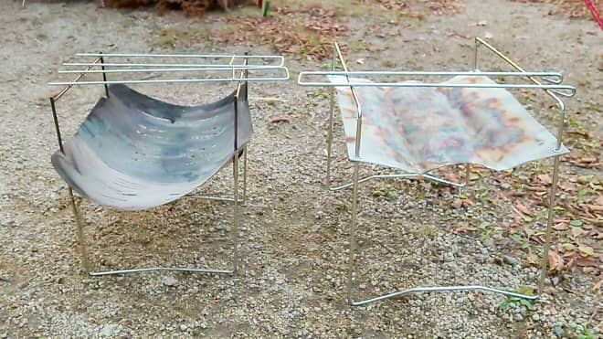 火床の素材はそれぞれメッシュとステンレス。ニンジャファイアースタンドソロの方が地面から火床までの高さがあります。逆に火床から五徳までの高さは低くなっているので、大きい薪を重ねて乗せると五徳が使えなくなります。