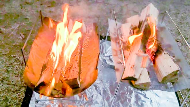 ほぼ風の無いキャンプ場にて、大きい薪3本に固形燃料で火をつけて放置したところ、ピコグリル398の方が良く燃えました。ピコグリル398のステンレスに比べると、ニンジャファイアースタンドソロのメッシュ素材は空気の抜けが良すぎて熱も逃がしてしまうようです。
