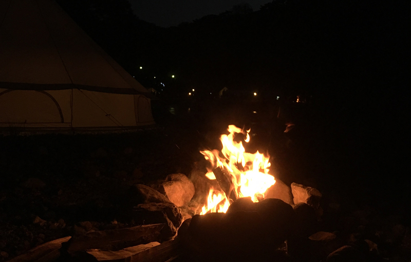 みんなで焚き火を囲んでキャンプファイアー