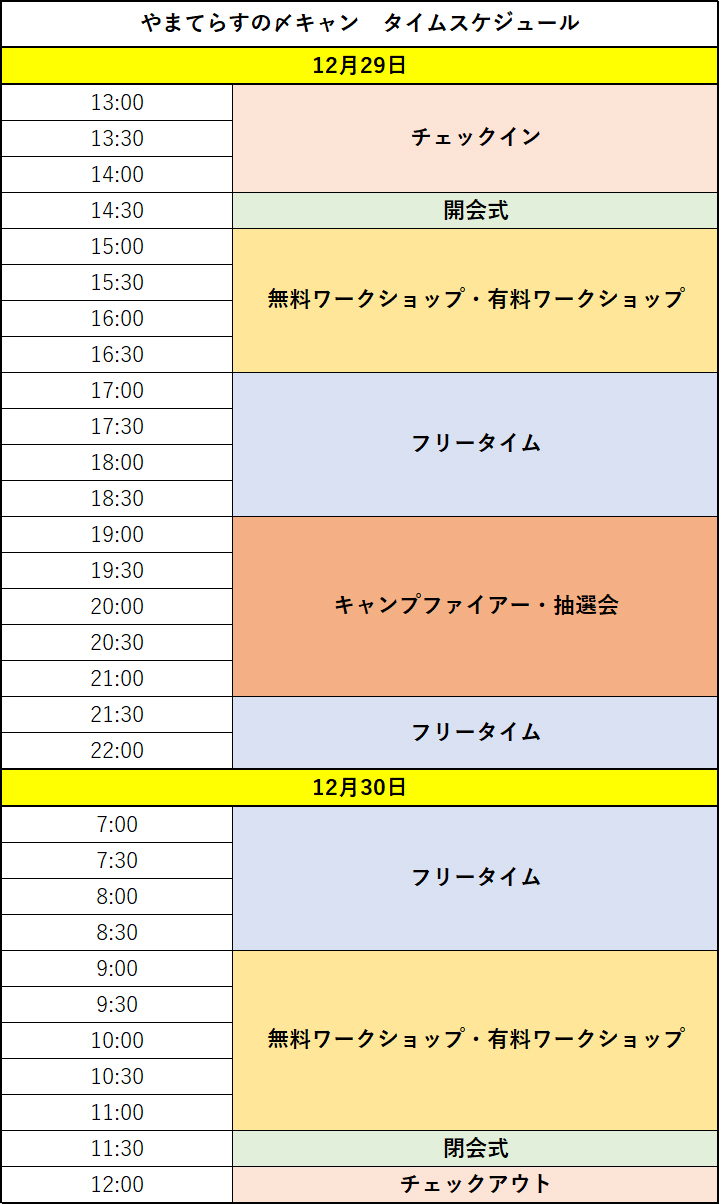 そんな「やまてらす」が、今年を締めくくるキャンプイベントとして12月29日(水)30日(木)の1泊2日で「やまてらすの〆キャン△」を開催します。