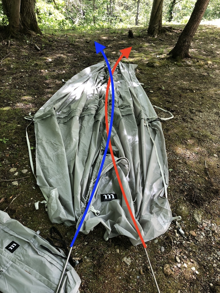 特にポールをクロスさせるときに間違えやすいです。テントの縫い目に沿ってポールを通せば失敗しないで済みます。とはいえ生地が薄く、スリーブがわかり辛いので何度やっても慣れません。