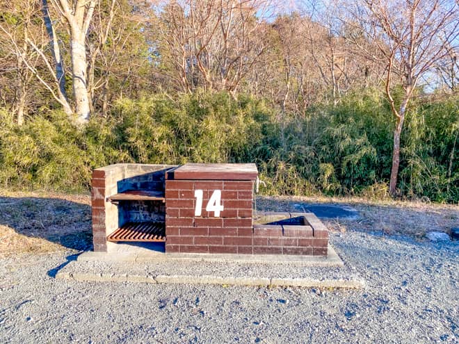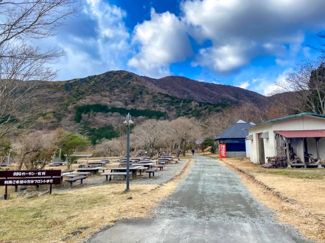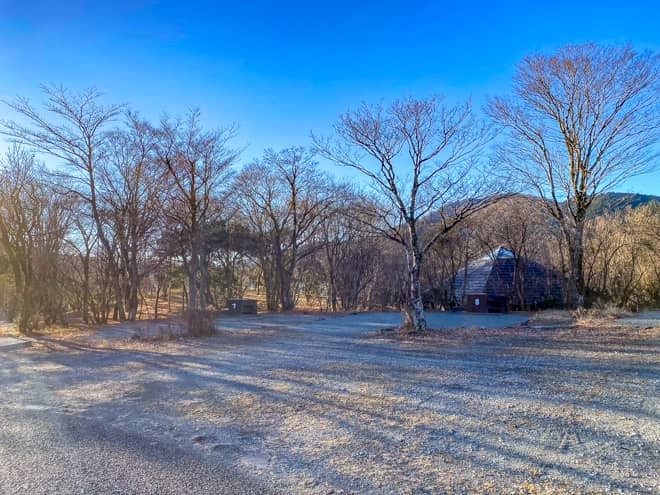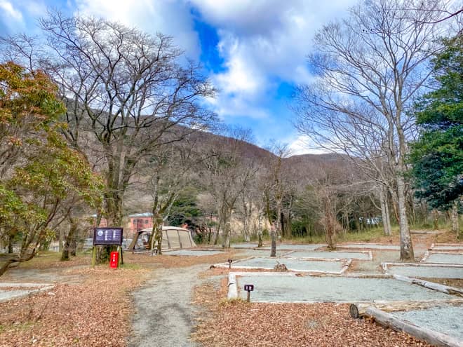芦ノ湖から少し離れた高台にはオートキャンプサイトがあります。オートキャンプサイトには各区画に専用水道と専用かまどがあり、電源付きの区画もありました。