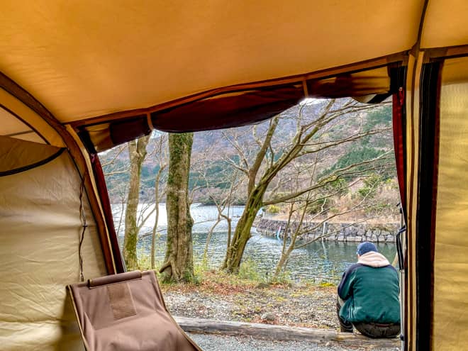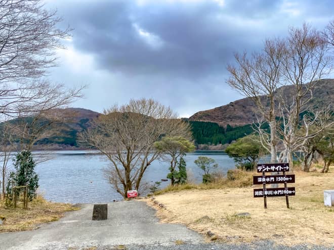 芦ノ湖はテントサイトの共有炊事場の目の前にあります。地図で見ると湖は見えなそうで心配しましたが、地図では見えない右側にも芦ノ湖が広がっていたので、バッチリ見えました。
