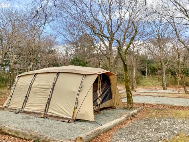 今回は区画が狭いことを事前にチェックしていたので、2区画借りて、1区画にテントを張り、手前の区画で焚き火を楽しむスタイルにしました。焚き火スペースを広々と使えるので、これはこれで良かったです。