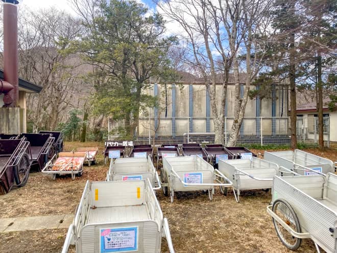 テントサイトには車を横付けできないので、駐車場に車を停めてリアカーで運びます。今回は大人4人で2往復して運びました。