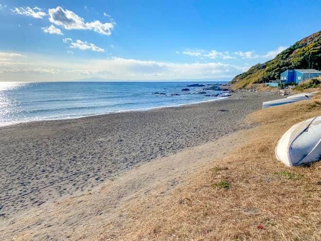 神奈川県の三浦半島にある「和田長浜海岸」は、海水浴シーズンオフの利用者が少ない時期であれば、砂浜での海辺キャンプを無料で楽しむことができます。
