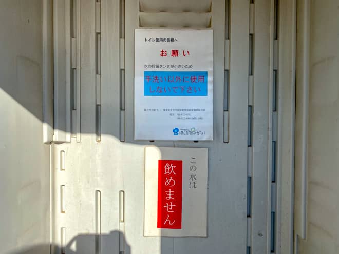 トイレの手洗いは、貯水タンクに限りがあるのでお手洗い以外には使用しないようにしましょう。飲用水ではないので、飲み物は必ず持参するようにして下さい。