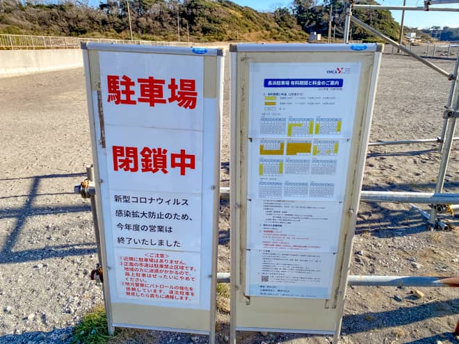 2022年1月現在、和田浜駐車場は新型コロナウイルスの感染拡大防止のため閉鎖されていました。