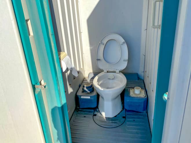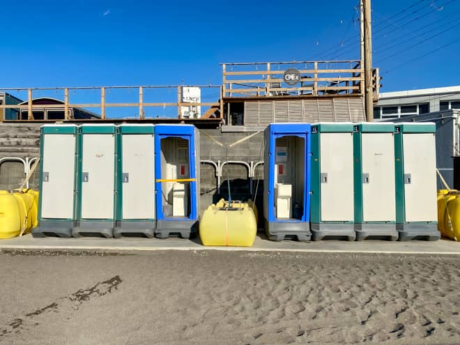 トイレは長浜駐車場の奥に簡易トイレが設置されていて、綺麗に清掃されていました。足でポンプを踏んで水を流すタイプですが、不快な匂いも無く、快適に使用できるはずです。トイレットペーパーも備え付けられていますが、一応予備を持参しておくと安心です。