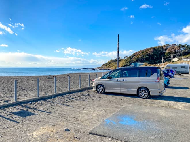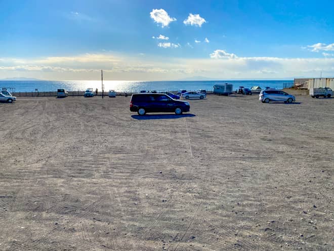 長浜駐車場は砂浜に面しており、約150台が駐車できる大型の駐車場です。駐車場の一角は海岸の目の前なので、疑似的にオートキャンプのように車のすぐ側でテント設営ができます。