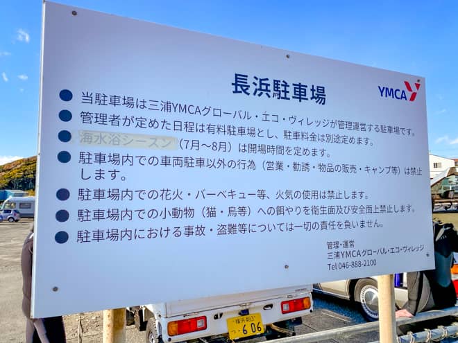 駐車場の管理は近くにある三浦YMCAグローバル・エコ・ヴィレッジが行なっています。駐車場についてのお知らせや注意事項は、YMCAの公式ページをご確認下さい。