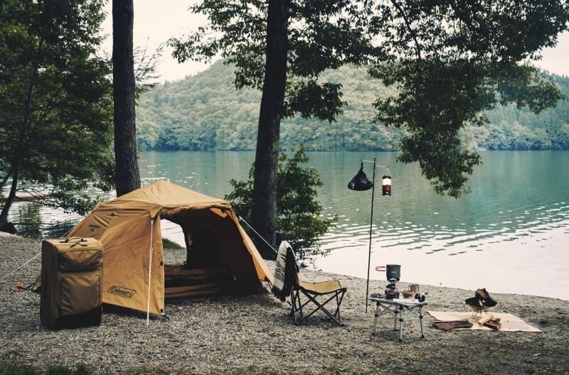 テント、マット、寝袋、チェア、ミニテーブル、LEDランタン、クッカーセット、シングルバーナー、