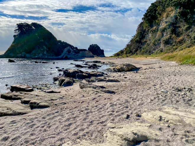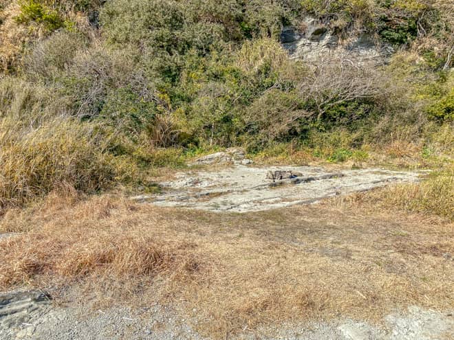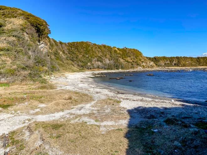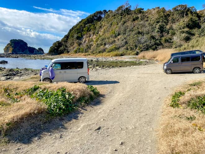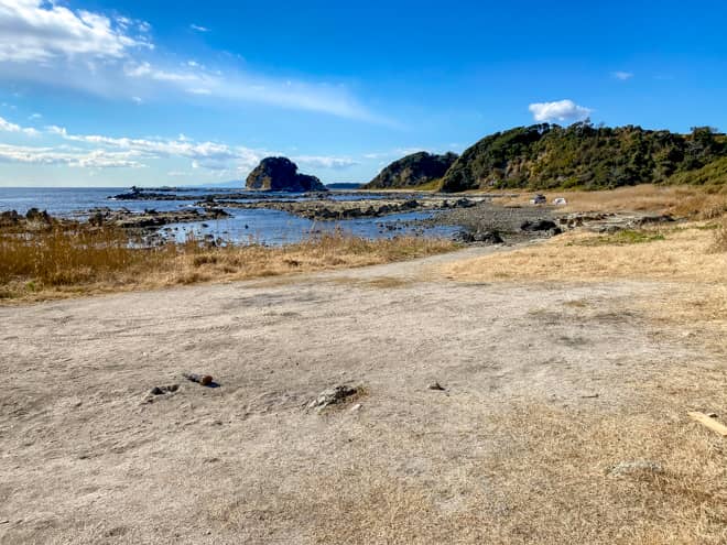 駐車場を通り抜けてそのまま奥に歩いていくと、ポツポツとテントを張れそうなスペースが点在しています。こちら側まで来るには大きな岩が転がっている岩場や、海水で濡れてツルツルの岩礁を越えたりしなければいけないので、オフロード用の車でも難しいかも知れません。