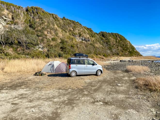 冬の平日はどこも空いていて、穏やかにキャンプを楽しむのにぴったりです。この辺りは地面も平地で、海面からの高さも確保されているので安全に過ごせそうです。
