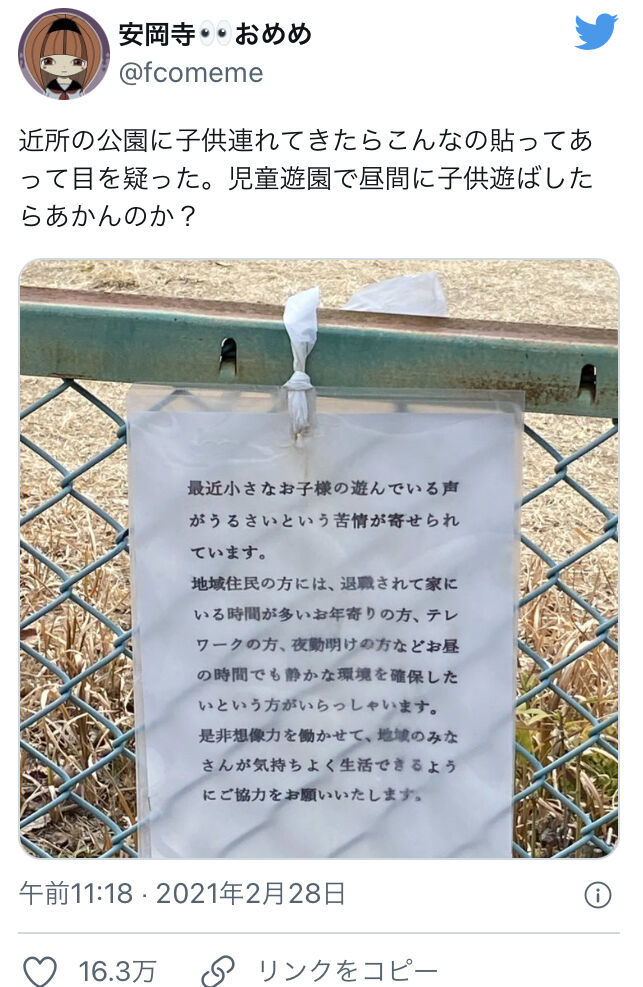 【画像】日本、終わる「公園で子供を遊ばせるな!近所には退職して家にいるお年寄りがいる!」 16.3万いいねWWWWWWWWWWWWWWWWWW