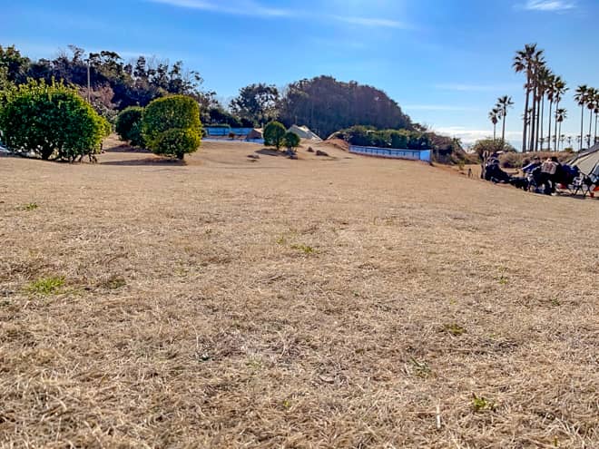 ヤシの木や館山ファミリーパークの名残が残っているので、設営場所は限られてきますが、設営できそうな場所は区画サイトのように高台になっているので、場所取りで悩むことは無さそうです。