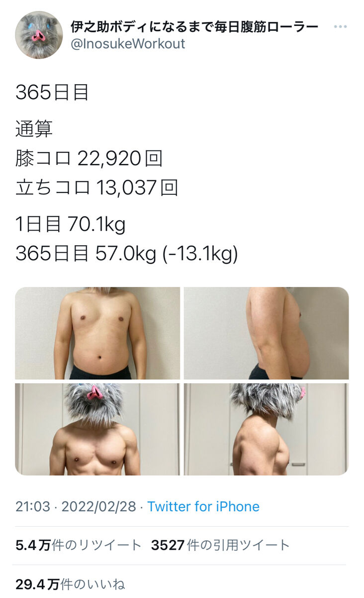 Twitter「腹筋ローラー365日続けた結果がこちら」(パシャ) 30万いいね