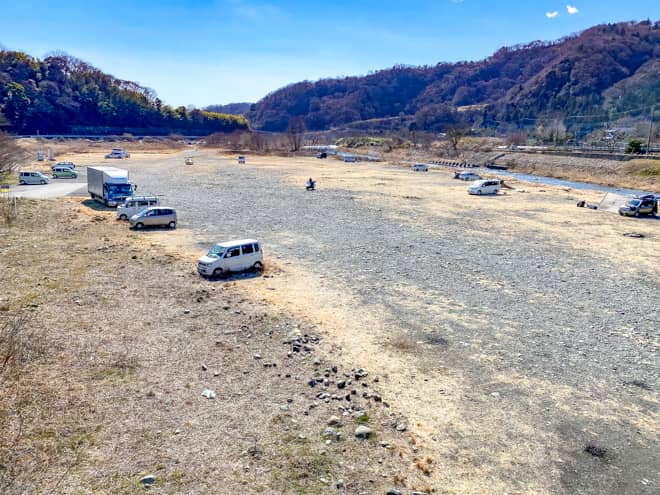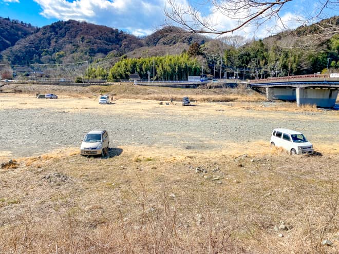 八菅橋河川敷はそのまま車の乗り入れが可能なので、特に駐車場として独立したスペースはありません。どこでも好きな場所に車を止めて、その近くでオートキャンプを楽しめます。