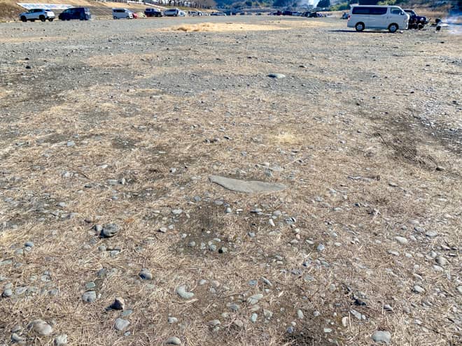 場内には大きな石がゴロゴロと落ちていたり、禁止されているはずの直火に使用された石組みのカマドが放置されていたりするので、車で走行する際は地面の状況に気を配るようにして下さい。特に直火跡には錆びた釘やネジが落ちていることが多いので、誤って釘を拾ってしまうとパンクに繋がる恐れがあります。