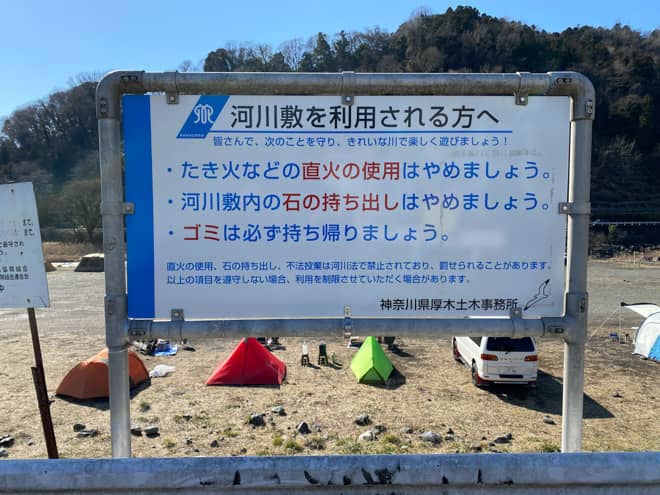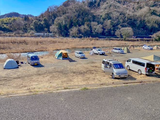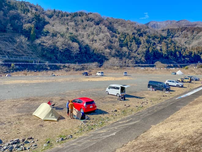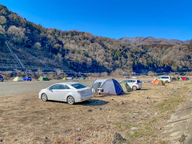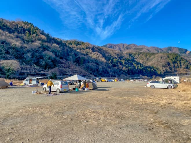 田代運動公園隣の中津川河川敷は、神奈川県民だけでなく県外のキャンパーからも人気の高い野営地で、週末になると撤収待ちが出るほど沢山のキャンパーが訪れます。