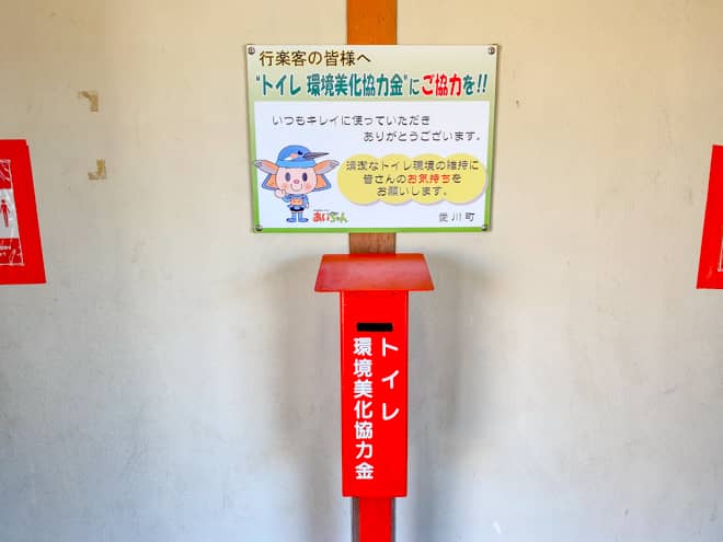 トイレの入り口には「トイレ環境美化協力金」の募金箱が設置されています。中津川河川敷でキャンプを楽しむ人たちが、トイレを利用する度にいくらか協力することで清掃環境の改善に繋がりますので、綺麗なトイレを維持するためにも、財布の中に余っている小銭をお気持ちとして投入しておきましょう。