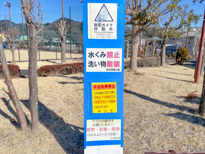中津川河川敷の隣にある田代運動公園に水場が設置されていましたが、現在はすべての蛇口が取り外されて使用中止となっています。2019年の7月頃までは水飲み用の蛇口が付けられていたという口コミも見られますが、現在は故障中で今後修理されるかも分かりません。