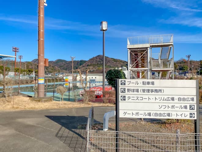 中津川河川敷の隣にある田代運動公園は、敷地面積62,864m²を誇り、その広さはなんと東京ディズニーランドの8分の1にも及びます。これを東京ドームで例えると1.3個分。公園内は町のスポーツ施設として野球場やテニスコート、プールやゲートボール場など数多くの施設が入っており、夏になるとスライダー付きプールは多くの利用客で賑わいます。